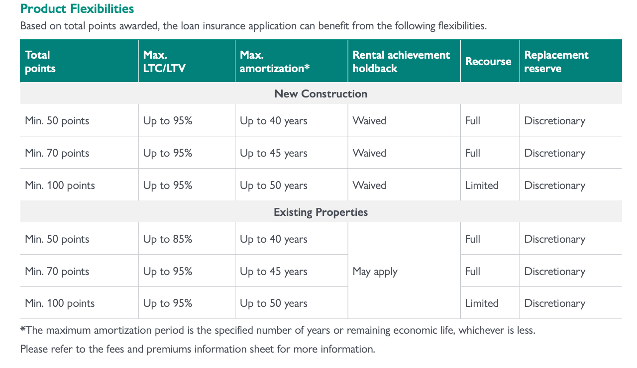 Most of these builds we be using the MLI select program from CMHC, which is a gamified point system that allows for some pretty great terms, such as 95% loan to value and loan to cost, as well as 30-40 amortizations.