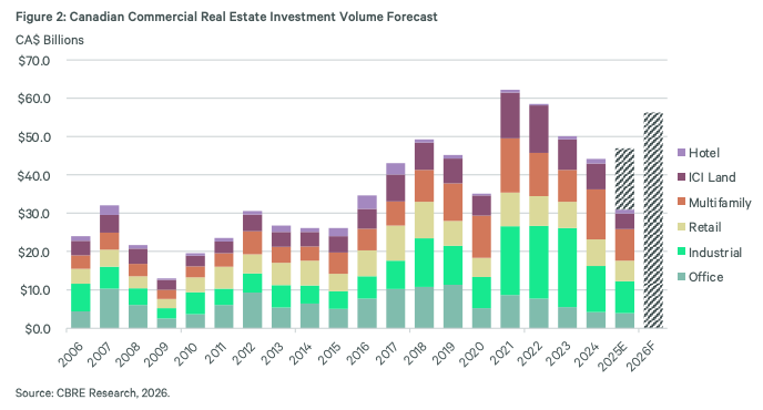 Canadian commercial real estate investment could hit $56 billion in 2026, according to CBRE's outlook — a massive rebound after volumes were cut in half during the slowdown. That's not just a recovery; it's a signal that capital is ready to move again.