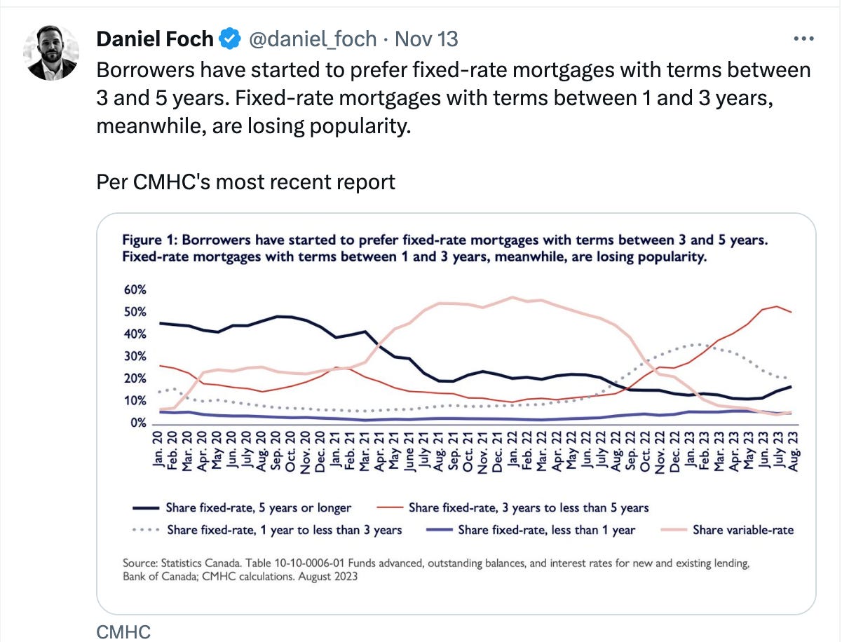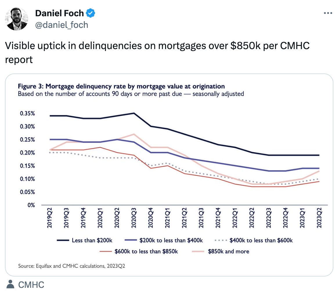 Per CMHC - 73% of outstanding residential mortgages were uninsured across chartered banks in 2023 Q2. This proportion is much higher than in 2016, when only 45% of mortgages were uninsured.