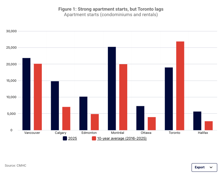 Purpose-built rental starts were the second highest since 1990 and exceeded condominium apartment starts in the City of Toronto for the first time. Incentives for missing middle housing, combined with relatively favourable financing and long‑term rental demand, supported purpose-built rental construction.”