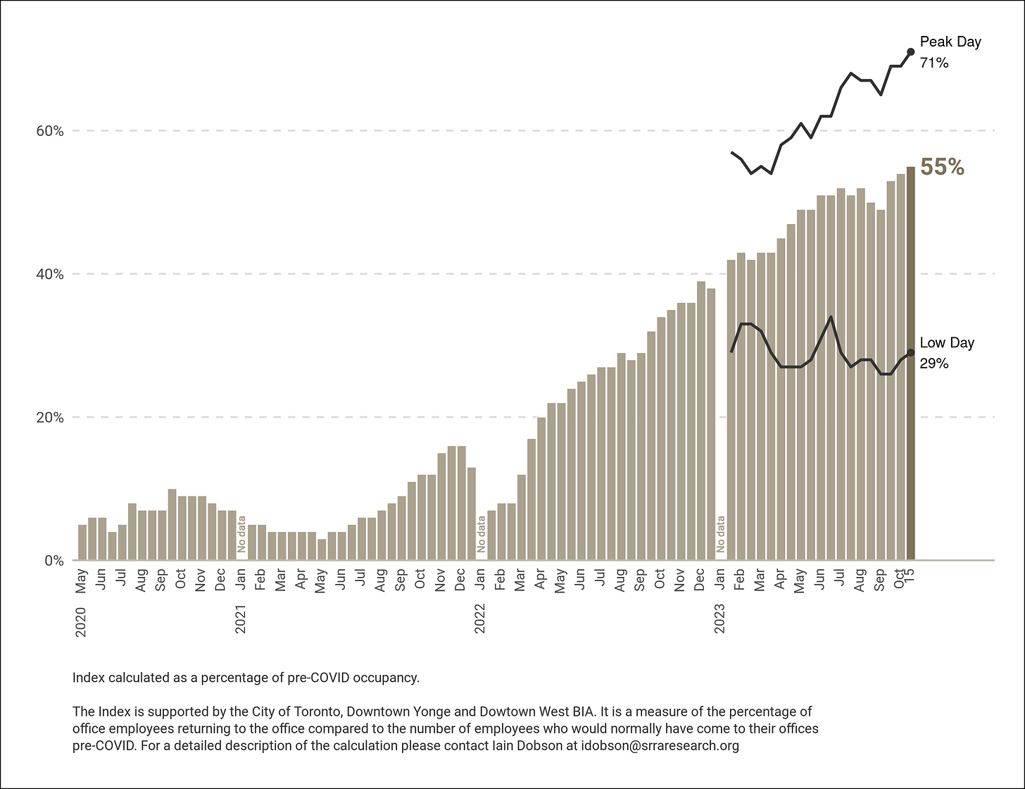 Per SRRA: “Mondays are beginning to attract more workers to the office while overall the Index shows a continued upward trend for the approximately 450,000 office workers in downtown Toronto.