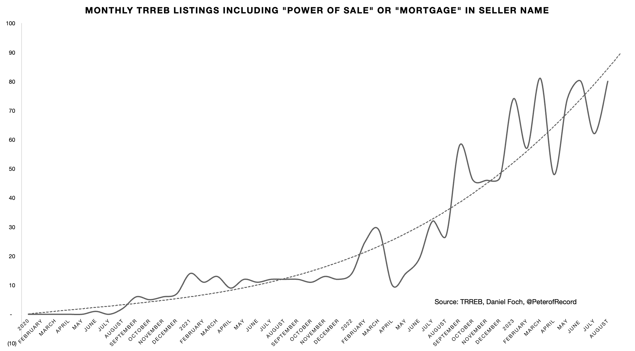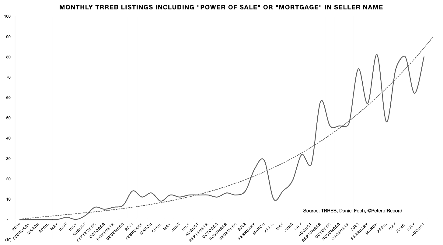 My challenge with this data is that banks are only required to report mortgages that are more than 90 days delinquent. During this 90-day period, a prudent lender would exercise their power of sale, the most common forced sale process used in Canada when a homeowner fails to repay their mortgage, and the property would likely have already appeared as a listing on the MLS.