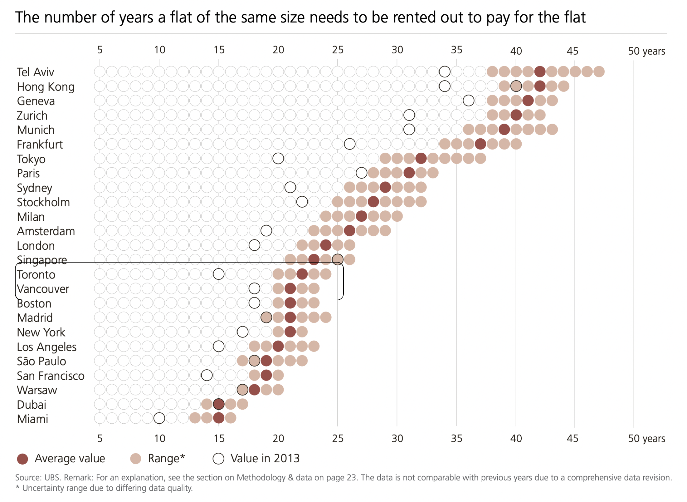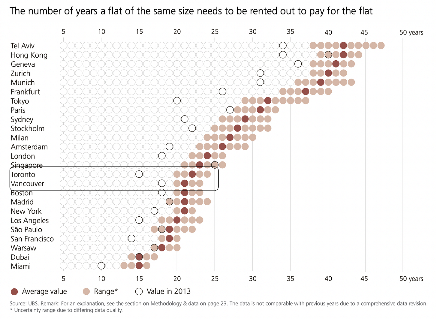 When looking at the price-to-rent statistic, Toronto and Vancouver actually seem to stack up quite nicely against our fellow “world class cities” seen in the UBS index. This chart shows the number of years a 650 sf apartment in the city centre would need to be rented to pay for itself: