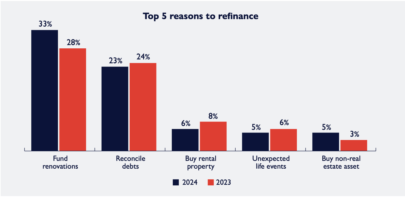 Homeowners are refinancing their mortgages primarily for purposes such as funding home renovations (33%) and reconciling debts (23%)