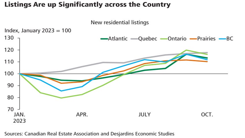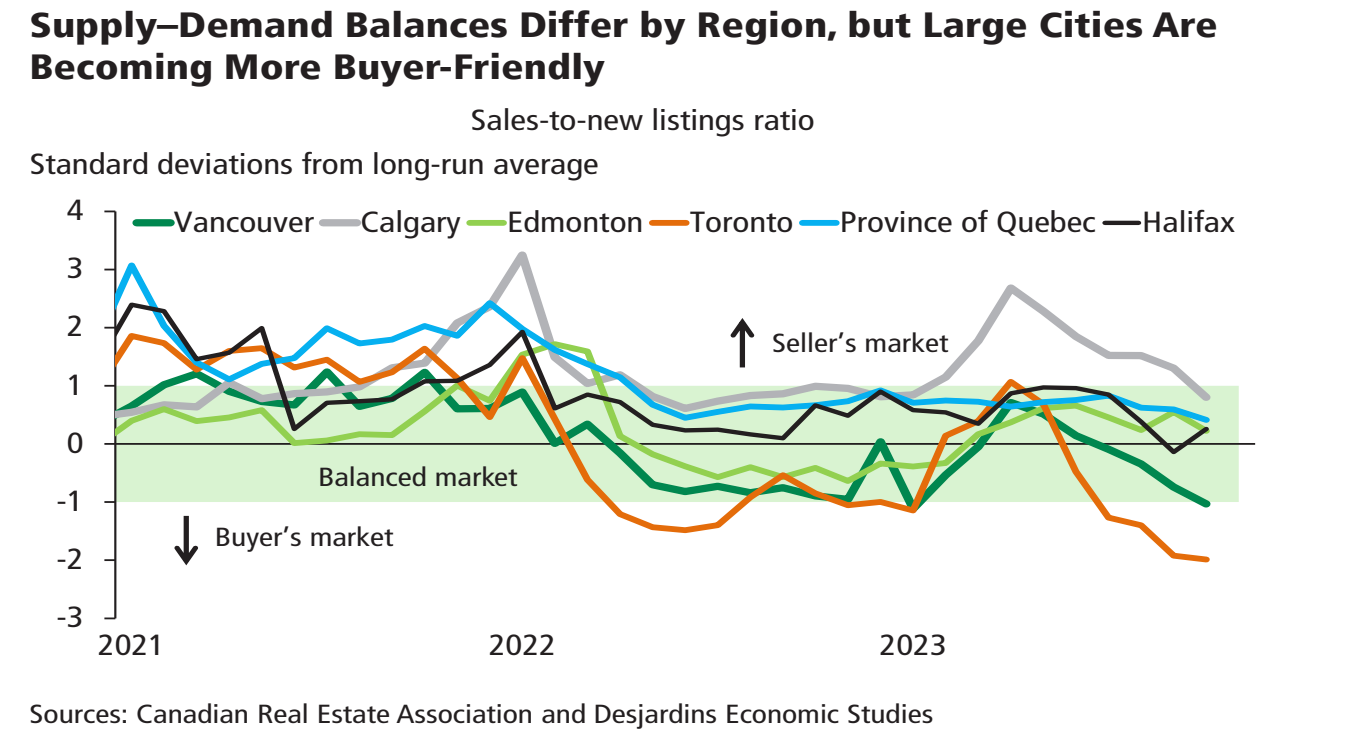 The second round of Bank of Canada rate hikes may have ended well before November 2023, but its effects certainly haven’t. Initially, sales activity in the high-priced Toronto and Vancouver markets bore the brunt of higher borrowing costs. Yet at the time of writing, weakness is spreading more broadly, and national-level home purchases have given back three quarters of the torrid gains experienced between January and June of this year. Listings have also climbed nearly across the board in a sign that homeowners may be struggling with higher mortgage rates. So while supply–demand balances are still tighter in Alberta than in Ontario and BC, all major markets are loosening